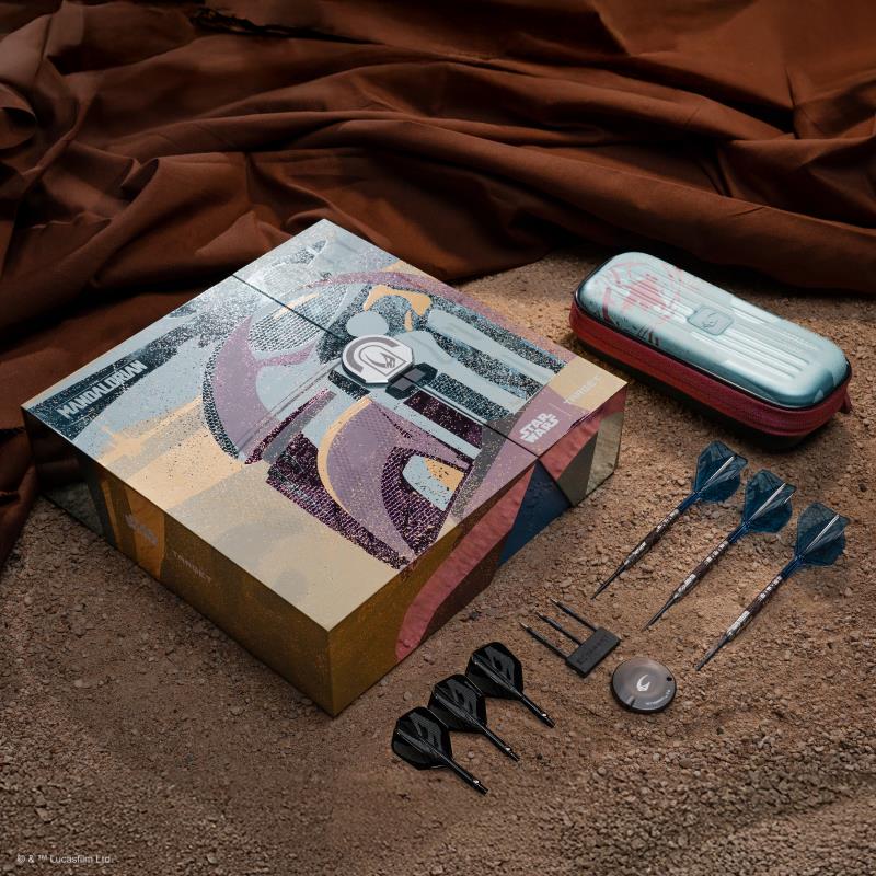 Die 95 %-Tungsten-Barrels sind präzisionsgefräst und mit detaillierten Fräsungen sowie grafischen Elementen versehen, die vom ikonischen Helm und der Rüstung des Mandalorianers inspiriert sind. Klare Linien, segmentierte Grip-Zonen und eine Kombination aus radialen und Ringfräsungen sorgen für einen konstanten, kontrollierten Griff, während das metallisch-silberne Finish die unverwechselbare Optik der Rüstung widerspiegelt.