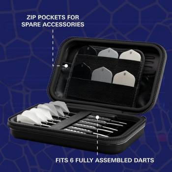 The wallet boasts efficient organization with two zip-locked pouch pockets, offering dedicated space for spare dart accessories such as flights, shafts, points, or a Swiss Point tool, making them easily accessible during intense games.